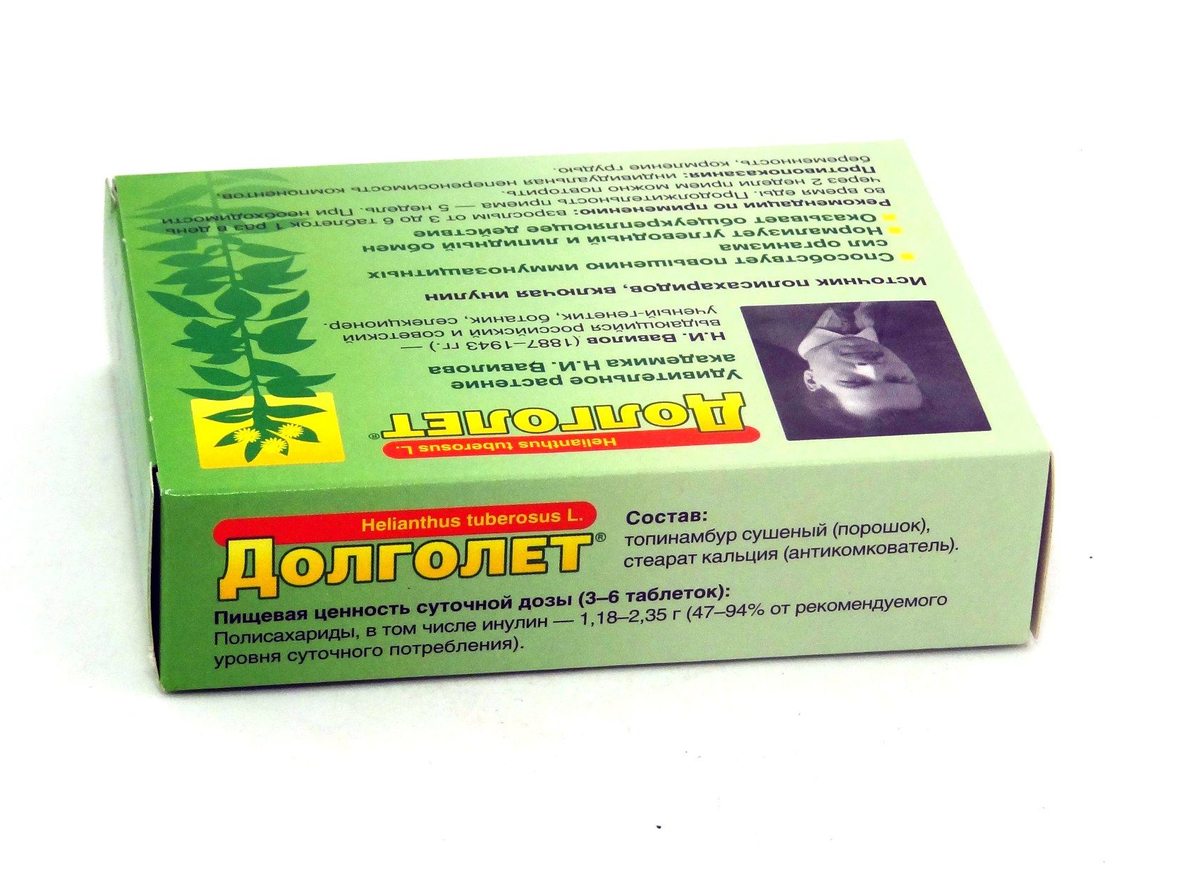 Долголет - биологически активная добавка, дополнительный источник инулина, кремния, магния и калия. Защищает от болезней сердца и сосудов, повышает неспецифическую резистентность организма, нормализует обменные процессы, улучшает состояние волос, ногтей, соединительной и костной тканей, предупреждает развитие сахарного диабета.
